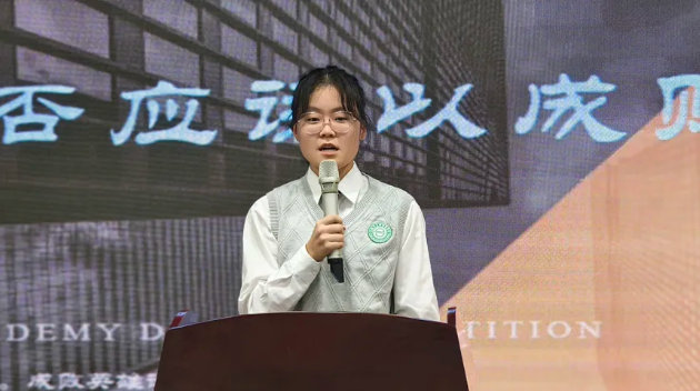 辩论正式开始,率先发言的是正方一辩王禕凡。他明确提出应该以对社会影响力的大小作为评判英雄们成败的标准。反方二辩柯雯馨毫不示弱,在发言时直指关键问题——“如果执意用成功和失败去衡量英雄,那么就是在支持唯成功论,将会对社会价值观造成极恶劣的冲击,是不良的价值观导向,是错误的价值判断。”