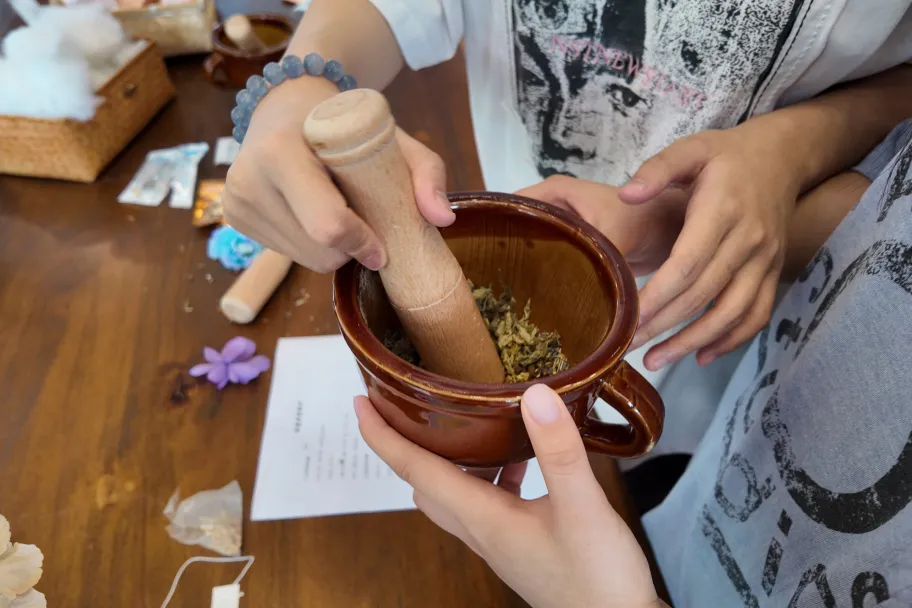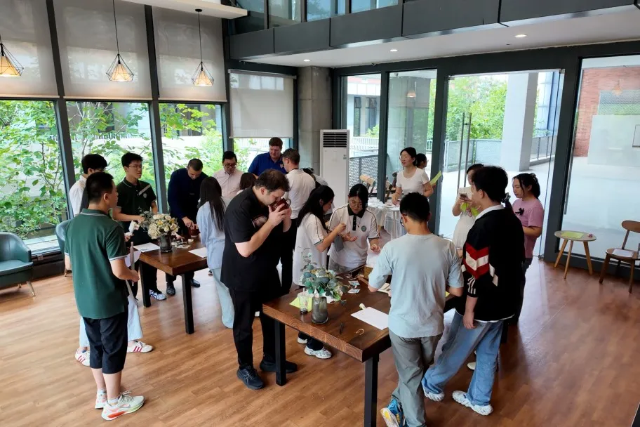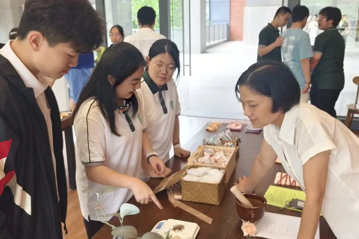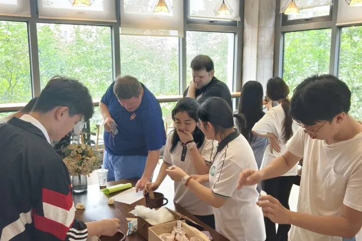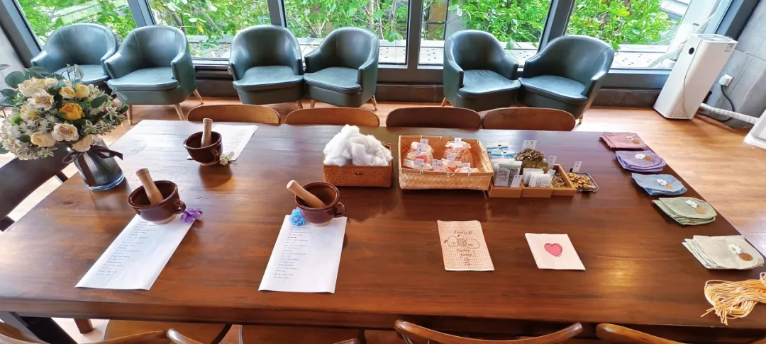 香囊制作围绕教师的实际需求展开,分为四种功效类型,并搭配健康小贴士与贺卡盲盒,让关怀与健康同行。学生们提前备好各类原料:有为改善睡眠准备薰衣草、陈皮与柏子仁;还有为提神醒脑配备薄荷、迷迭香与桉叶。中教与外教齐聚一堂,学生们一边演示制作,一边讲解中药功效:“艾草防蚊,适合常去户外的老师”“陈皮配甘草,健脾理气,疲劳时闻一闻很舒缓”。外教们拾起草药细细端详,目光如发现新诗的旅人。这一刻,中药不再仅是药材,它是文化,是体贴,是一段可以触摸的东方诗意。