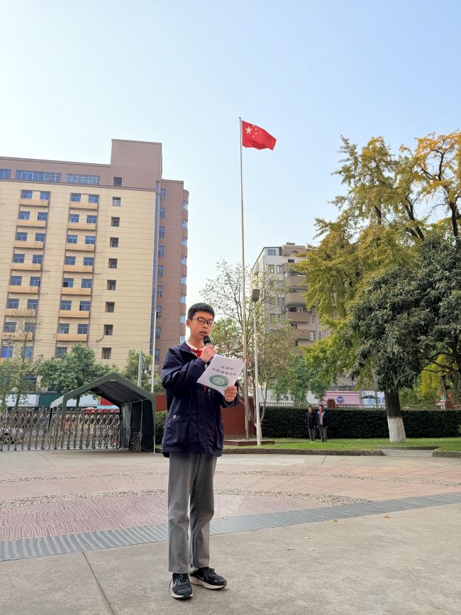 我是来自初二(12)班的丁闻韬。今天我们相聚在五星红旗下,共同聚焦12月4日全国法制宣传日。作为初二学子,我们在道德与法治课上早已相识“法律”——我们读懂了“权利与义务”,分清了“规则与自由”,其实这些课本里的知识,早已悄悄融入生活的方方面面,成为守护我们成长的“隐形标尺”。
