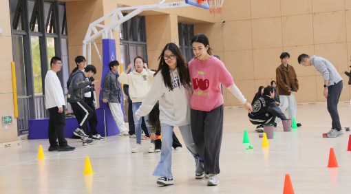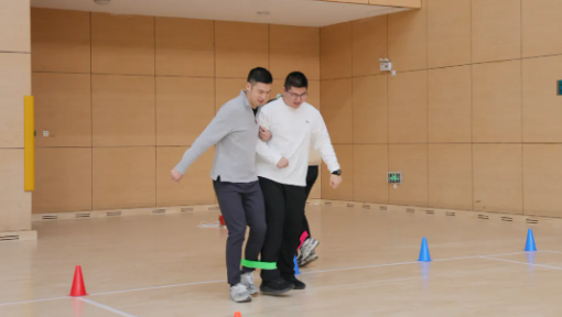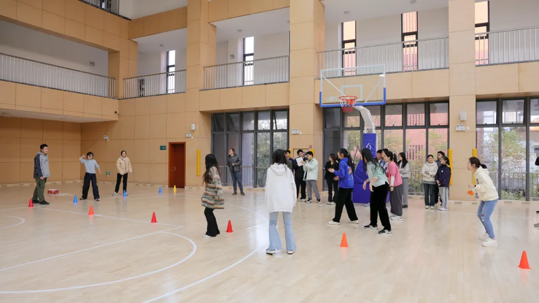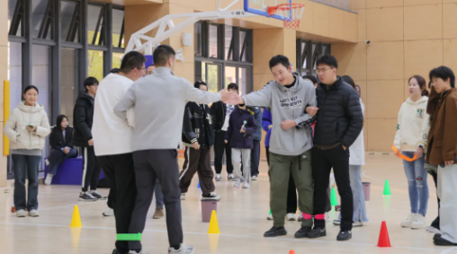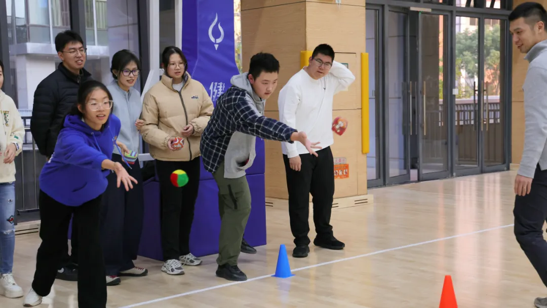 室内运动会节奏紧凑、亮点纷呈,“两人三足”赛道上,师生们用绑带紧紧相连,左脚右脚默契同步,朝着终点奋力冲刺。