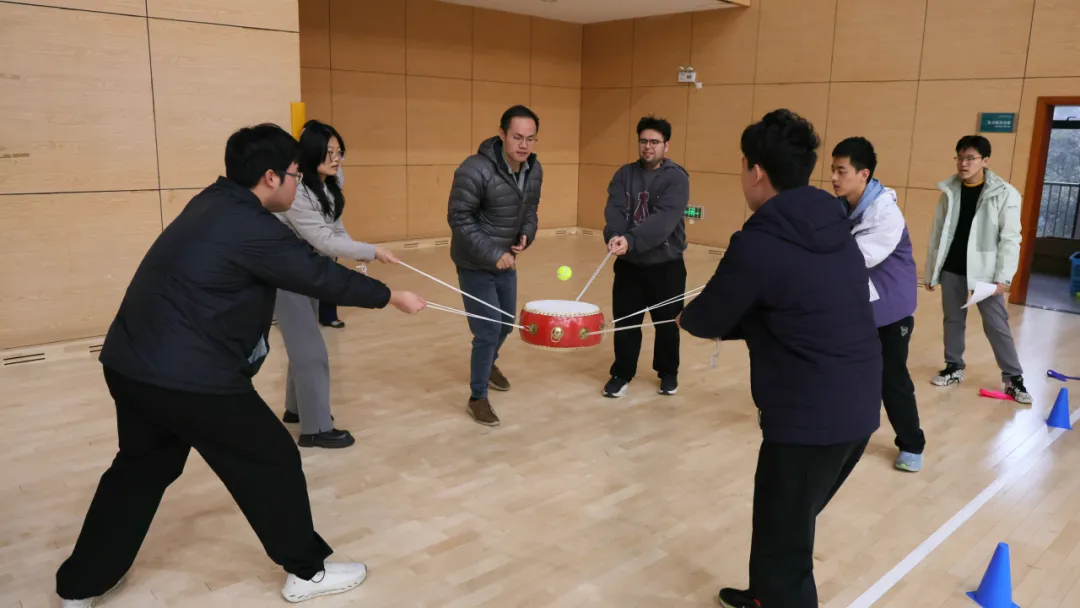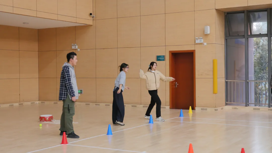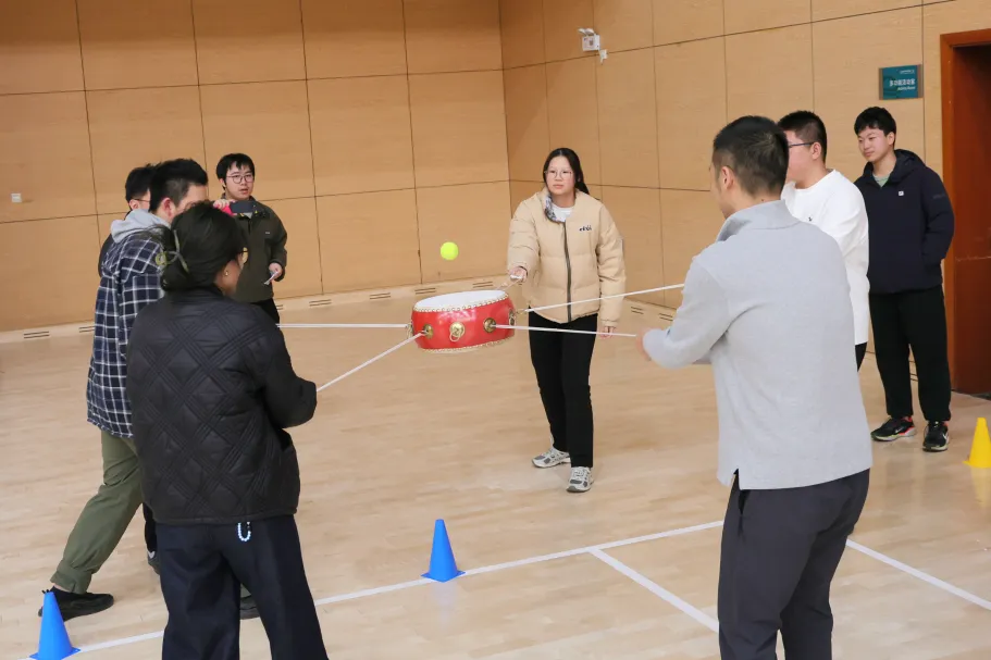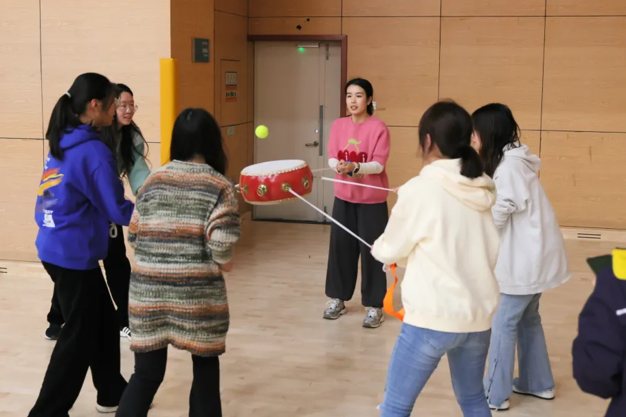 “同心击鼓”现场,师生们围站鼓边、手牵鼓绳、紧盯小球,根据球的落点实时调整力度与方向,是最考验师生多人协作能力的比拼。