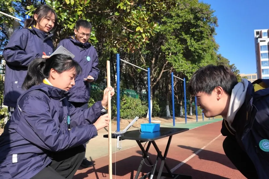 近日,大桥国际部物理组开展了一场别开生面的物理户外探秘营活动。同学们将实验室搬到校园的各个角落,在操场、湖边和林荫道中探索物理规律的奥秘,用实践验证真知,在自然中感受科学的魅力。