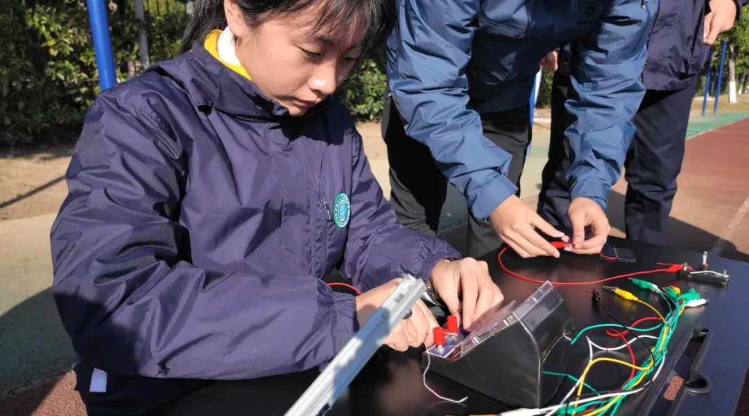 利用太阳能板进行光电转换实验,学生们在树荫下探索清洁能源的奥秘。随着光照强度的变化,电压读数的波动让抽象的电学原理变得触手可及。