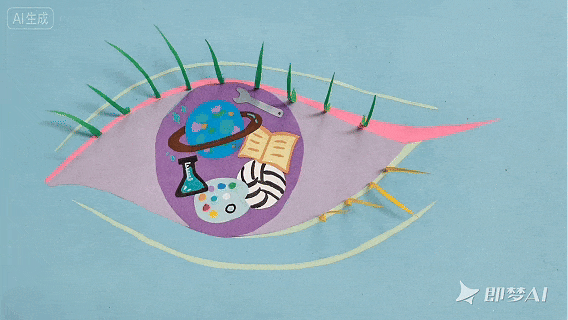这一次,同学们先用剪刀和彩纸进行纯粹的物理创作,主题是 “生命力量” 。他们齿轮交织的心脏、舒展的骨骼、灵动的眼眸。然后,他们将作品扫描,交由AI视频生成模型处理。