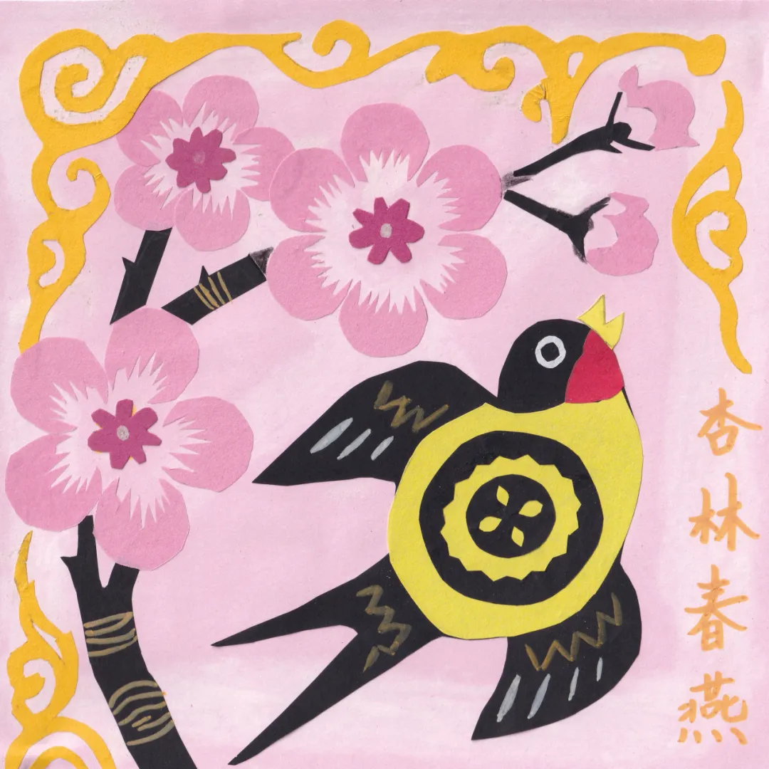 在实际操作中,我发现不同AI生成的画面风格差异明显,另外,口令精准度影响大,细节描述越精确,画面越贴合。难点是让元素自然融合,尤其是要表达出传统符号的神韵。那幅 “杏林春燕”,杏花的艳、春燕的灵,最贴近我对库淑兰风格的设想,色彩浓艳又不失灵动。