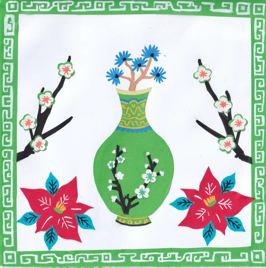任务很明确:以“百鸟朝凤”、“万紫千红”等吉祥主题为内容,以库淑兰的艺术风格为灵魂,通过文字指令引导AI生成图像,并写下感想,最终将画面以手工剪贴的形式表现出来。
