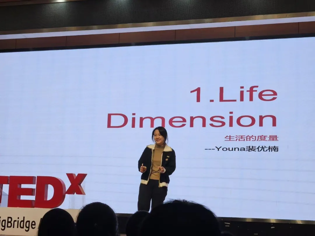 首先上场的是本次活动的组织者裴优楠同学,她带来的主题演讲是《Life Dimension》。曾因统计考试失利而陷入迷茫的她,在朋友陪伴、活动组织与烹饪爱好中再次找到了自信与自我价值。她跳出分数执念,坦言人生是多维度的拼贴画,而非单一的数据。她用亲身经历告诉大家,抛开标准化衡量,每个人独特的故事才是生命的真谛。