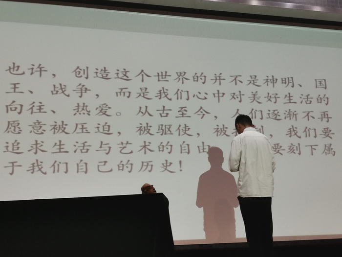 伴随着同学们热烈的掌声,汇演拉开了序幕。台上方存豪英客,热血奔腾心飞扬。首先迎接我们的是直升1班的历史剧《刻》。首先上台的青年雕刻家佝偻着背部,吃力地用锤子敲打着面前的雕塑,十分艰辛。一旁的徒弟心中顿感悲戚与无奈。在监工的皮鞭下,在学者的威压下,雕刻家被压弯了腰,按低了头,毒打了身,但是他的灵魂却高昂着头。垂下的头颅只是为了为了让思想高扬,你若有一个不屈的灵魂,脚下必有一片坚实的土地。身被奴役灵魂不屈,讴歌艺术之魂不朽!中年雕刻家有家庭负累、徭役繁重,无奈悲叹!老年雕刻家酷爱历史、勇攀历史高峰,以老到沉稳的嗓音升华了《刻》的主旨。